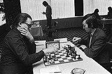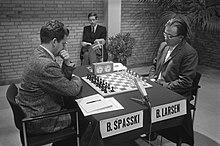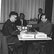 Larsen was a six-time Danish Champion and a Candidate for the World Chess Championship on four occasions, reaching the semifinal three times. He had multiple wins over all seven World Champions who held the title from 1948 to 1985: Mikhail Botvinnik, Vasily Smyslov, Mikhail Tal, Tigran Petrosian, Boris Spassky, Bobby Fischer, and Anatoly Karpov,[2] but lifetime negative scores against them. On a percentage basis, his best score against a World Champion was with Max Euwe. Larsen and Euwe met over the board only once, at the Munich Olympiad in 1958; the game ended in a draw.[3] From the early 1970s, he divided his year between Las Palmas and Buenos Aires,[1] with his Argentinian-born wife. He suffered from diabetes and died in 2010 from a cerebral haemorrhage.[4]