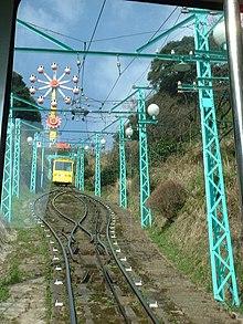 The Beppu Rakutenchi Cable Line (別府ラクテンチケーブル線, Beppu Rakutenchi Kēburu-sen) is a Japanese funicular line in Beppu, Ōita. The line opened in 1929 as a gateway to Beppu Rakutenchi amusement park on Mount Tateishi. Although the line is legally considered as a public transit, not an attraction ride, riders have to pay the amusement park admission fee to take the funicular line. Local residents in Otobaru, the settlement on the mountain, are allowed to ride the line without the fee. The line is unique in the country as it is operated by Okamoto MFG (岡本製作所, Okamoto Seisakujo), an amusement ride maker.