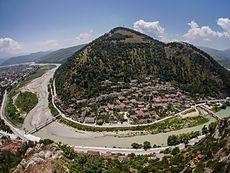 Berat lies on the right bank of the river Osum, a short distance from the point where it is joined by the Molisht river. The old city centre consists of three parts: Kalaja (on the castle hill), Mangalem (at the foot of the castle hill) and Gorica (on the left bank of the Osum). It has a number of buildings of architectural and historical interest. The pine forests above the city, on the slopes of the towering Tomorr mountains, provide a backdrop of appropriate grandeur. The Osumi river has cut a 915-metre deep gorge through the limestone rock on the west side of the valley to form a precipitous natural fortress, around which the town was built on several river terraces.