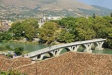 Gorica Bridge, which connects two parts of Berat, was originally built from wood in 1780 and was rebuilt with stone in the 1920s.[49] The seven-arch bridge is 129 metres (423 ft) long and 5.3 metres (17 ft) wide and is built about 10 metres (33 ft) above the average water level.[49] According to local legend, the original wooden bridge contained a dungeon in which a girl would be incarcerated and starved to appease the spirits responsible for the safety of the bridge.[48][49]