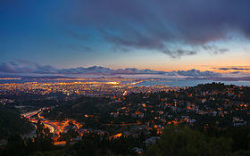 It is common to hear the term, "Oakland Hills" to refer to that section of the Berkeley Hills that runs along the east side of Oakland. As a proper name or recognized toponym, it is technically incorrect. When used on maps, the exact south end of the "Berkeley Hills" is unclear, but the maps of the USGS show them stretching well south into the northeastern portion of Oakland.[3] It does not, in any case, correspond to any political boundaries, only to a geographic feature (much as "San Francisco Bay" is not limited to that stretch of the Pacific inlet within the bounds of the City and County of San Francisco). The ridge extends south through Oakland and San Leandro to the drainage of San Leandro Creek called Castro Valley, and geologically, continues southward above the line of the Hayward Fault. In the section above East Oakland to Castro Valley, the ridge appears on most maps as the San Leandro Hills.[4]
