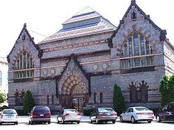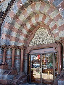Designed by New York architect William Appleton Potter, the original Berkshire Athenaeum building was erected in 1874-1876 as a gift from railway magnate and native son Thomas Allen. It is in the High Victorian Gothic style, constructed of dark blue limestone from Great Barrington, red freestone from Longmeadow and red granite from Missouri. The 1876 building became the Berkshire County Registry of Deeds in 1975 when the Berkshire Athenaeum moved to the current library building two doors away.