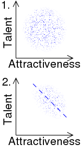 In figure 2, someone sampling the population using celebrities may wrongly infer that talent is negatively correlated with attractiveness, as people who are neither talented nor attractive do not typically become celebrities.