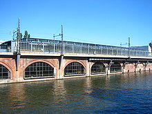 The Stadtbahn line is an elevated rail line with viaducts totalling 8 kilometers (5.0 mi) in length and including 731 masonry viaduct arches. A further 2 kilometers (1.2 mi) of the line are situated on 64 bridges, that cross adjoining streets and (three times) the River Spree. The remaining length of the line is on an embankment.