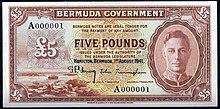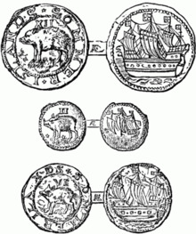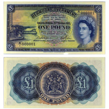 The first Bermudian currency issue was the so-called "hogge money", 2, 3 and 6 pence, and 1 shilling coins issued between 1612 and 1624. Their name derives from the appearance of a pig on the obverse. At this time, Bermuda was known as Somers Island (which is still an official name) and this name appears on the coins. The next coins to be issued were copper pennies in 1793. When Bermuda adopted the sterling currency system in the first half of the nineteenth century, the coinage that circulated was exactly the same coinage that circulated in the United Kingdom. No special varieties of the sterling coinage were ever issued for general use in Bermuda. However, special silver 1 crown (five shillings) coins were issued in 1959 and again in 1964. These commemoratives were similar in appearance to the British crown coins, but featured Bermudian designs on their reverses. The first issue has a map of the islands to mark their 350th anniversary of settlement.[1] The second coin shows the islands' coat of arms.[2] Because of the rising price of precious metals, the diameter of the 1964 issue was reduced from 38 to 36 millimeters and the silver content dropped from 92.5% to 50%. Their respective mintages were 100,000 and 500,000 (30,000 of the latter being issued in proof). Both coins remain readily available to collectors.