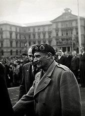 Montgomery made a great effort to appear before troops as often as possible, frequently visiting various units and making himself known to the men, often arranging for cigarettes to be distributed. Although he still wore a standard British officer's cap on arrival in the desert, he briefly wore an Australian broad-brimmed hat before switching to wearing the black beret (with the badge of the Royal Tank Regiment and the British General Officer's badge) for which he became notable. The black beret was offered to him by Jim Fraser while the latter was driving him on an inspection tour.[73] Both Brooke and Alexander were astonished by the transformation in atmosphere when they visited on 19 August, less than a week after Montgomery had taken command.[71]