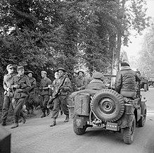 An American break-out was achieved with Operation Cobra and the encirclement of German forces in the Falaise pocket at the cost of British losses with the diversionary Operation Goodwood.[119] On the early morning of 18 July 1944, Operation Goodwood began with British heavy bombers beginning carpet bombing attacks that further devastated what was left of Caen and the surrounding countryside.[120] A British tank crewman from the Guards Armoured Division later recalled: "At 0500 hours a distant thunder in the air brought all the sleepy-eyed tank crews out of their blankets. 1,000 Lancasters were flying from the sea in groups of three or four at 3,000 feet (910 m). Ahead of them the pathfinders were scattering their flares and before long the first bombs were dropping".[121] A German tankman from the 21st Panzer Division at the receiving end of this bombardment remembered: "We saw little dots detach themselves from the planes, so many of them that the crazy thought occurred to us: are those leaflets?...Among the thunder of the explosions, we could hear the wounded scream and the insane howling of men who had [been] driven mad".[122] The British bombing had badly smashed the German front-line units; e.g., tanks were thrown up on the roofs of French farmhouses. Initially, the three British armoured divisions assigned to lead the offensive, the 7th, 11th and the Guards, made rapid progress and were soon approaching the Borguebus ridge, which dominated the landscape south of Caen by noon.[123]