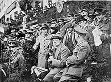 Montgomery served at the Battle of Passchendaele in late 1917 before finishing the war as GSO1 (effectively chief of staff) of the 47th (2nd London) Division,[27] with the temporary rank of lieutenant colonel.[28] A photograph from October 1918, reproduced in many biographies, shows the then unknown Lieutenant Colonel Montgomery standing in front of Winston Churchill (then the Minister of Munitions) at the parade following the liberation of Lille.[29]