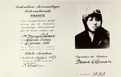 Coleman took a French-language class at the Berlitz school in Chicago, and then traveled to Paris on November 20, 1920. She learned to fly in a Nieuport Type 82 biplane, with "a steering system that consisted of a vertical stick the thickness of a baseball bat in front of the pilot and a rudder bar under the pilot's feet."[7] On June 15, 1921, Coleman became not only the first African-American woman to earn an international aviation license from the Fédération Aéronautique Internationale, and the first American of any gender or ethnicity to do so, but the first African-American woman to earn an aviation pilot's license. Determined to polish her skills, Coleman spent the next two months taking lessons from a French ace pilot near Paris, and in September 1921 sailed for New York. She became a media sensation when she returned to the United States.
