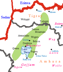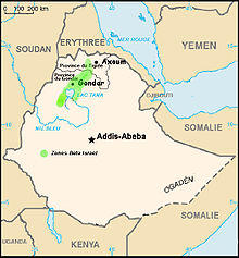 Beta Israel lived in northern and northwestern Ethiopia, in more than 500 small villages spread over a wide territory, alongside populations that were Muslim and predominantly Christian.[6] Most of them were concentrated in the area around and to the north of Lake Tana, in the Gondar region among the Wolqayit, Shire and Tselemt, Dembia, Segelt, Quara, and Belesa.