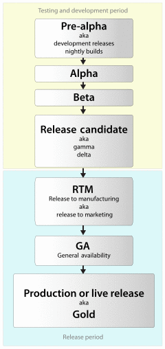 General availability (GA) is the marketing stage at which all necessary commercialization activities have been completed and a software product is available for purchase, depending, however, on language, region, electronic vs. media availability.[18] Commercialization activities could include security and compliance tests, as well as localization and worldwide availability. The time between RTM and GA can be from a week to months in some cases before a generally available release can be declared because of the time needed to complete all commercialization activities required by GA. At this stage, the software has "gone live".
