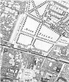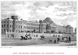 While the logic of Lewis's report was clear, the Court of Governors, facing continuing financial difficulties, only resolved in 1803 behind the project of erecting a new Bethlem at a new site. A fund-raising drive for this purpose was initiated in 1804.[176] In the interim, attempts were made to rehouse patients at local hospitals and admissions to Bethlem, sections of which were deemed uninhabitable, were significantly curtailed such that the patient population fell from 266 in 1800 to 119 in 1814.[177] Financial obstacles to the proposed move remained significant. A national press campaign to solicit donations from the public was launched in 1805. Parliament was successfully lobbied to provide £10,000 for the fund under an agreement whereby the Bethlem Governors would provide permanent accommodation for any lunatic soldiers or sailors of the French Wars.[178] Early interest in relocating the hospital to a site at Gossey Fields had to be abandoned due to financial constraints and stipulations in the original lease agreement for Moorfields which precluded its resale. Instead, the Governors engaged in protracted negotiations with the City to swap the Moorfields site for another municipal owned location at St. George's Fields in Southwark, south of the river Thames. The land transaction was finally concluded in 1810 and provided the Governors with a 12 acres (4.9 ha; 0.019 sq mi) site for the new hospital in what was a swamp-like, impoverished, highly populated, and industrialised region of London.[179]