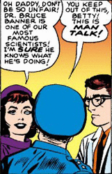 The only daughter of General Thaddeus E. "Thunderbolt" Ross, Betty spent her formative years firmly under her father's strict supervision. After her mother died during Betty's teenage years, she was sent away to boarding school. After graduating, the introverted young woman returns to her father's side while he is in charge of a top-secret project to create a new type of weapon involving gamma radiation, known as the Gamma Bomb. The head scientist on the project is Dr. Robert Bruce Banner. Betty is immediately captivated by Banner's intellect and soft-spoken manner. However, less than an hour after their first meeting, Banner is caught in a test detonation of the Gamma Bomb and becomes the Incredible Hulk.[11] Banner's efforts to keep his condition a secret from Betty only serve to alienate her from him. She is then romantically pursued by Major Glenn Talbot, the new aide attached to her father's Hulkbuster task force.