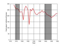 At the start of World War II, the UK was highly dependent on coal, not only to power ships and trains, but as the main source of energy for electricity generation.[5] Although output from mines had increased as the world economy recovered from the Great Depression, it was in decline again by the time war broke out in September 1939.[2]