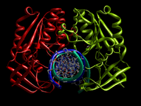 Although restriction endonucleases show little sequence similarity, crystal structures reveal that they all share a highly similar α/β core consisting of a six-stranded β-sheet flanked by five α-helices, two of which mediate dimerization.[1] This core carries the active site (catalytic center) and the residues that contact DNA in the major groove. BglII is unique in that its α/β core is augmented by a β-sandwich subdomain that has several projections that extend outward to grip the DNA, allowing BglII to completely encircle the DNA molecule. This atypical feature of BglII suggests a unique hinge motion for DNA binding and release.[2] Comparative structural studies of the free enzyme vs. the BglII-DNA complex showed that the enzyme opens by a dramatic scissor-like motion, accompanied by a complete rearrangement of the α-helices at the dimer interface. These structural studies also revealed that within each monomer a set of residues lowers or raises to alternatively sequester or expose the active site residues. These dramatic differences in structure in the free vs. bound enzyme have yet to be observed in any other restriction endonuclease and may possibly represent a novel mechanism for capturing DNA that may extend to other proteins that encircle DNA.[2][3]