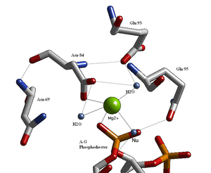 Structural studies of endonucleases have revealed a similar architecture for the active site with the residues following the weak consensus sequence Glu/Asp-(X)9-20-Glu/Asp/Ser-X-Lys/Glu. BglII's active site is similar to other endonucleases', following the sequence Asp-(X)9-Glu-X-Gln. In its active site there sits a divalent metal cation, most likely Mg2+, that interacts with Asp-84, Val-94, a phosphoryl oxygen, and three water molecules. One of these water molecules, is able act as a nucleophile because of its proximity to the scissile phosphoryl (its orientation being fixed by a hydrogen bond with the side chain amide oxygen of Gln-95[1][4]) and its contact with the metal cation (which lowers its pKa, promoting the water's nucleophilicity).