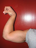 The biceps (Latin: musculus biceps brachii, "two-headed muscle of the arm", sometimes abbreviated to biceps brachii) is a large muscle that lies on the front of the upper arm between the shoulder and the elbow. Both heads of the muscle arise on the scapula and join to form a single muscle belly which is attached to the upper forearm. While the biceps crosses both the shoulder and elbow joints, its main function is at the elbow where it flexes the forearm and supinates the forearm. Both these movements are used when opening a bottle with a corkscrew: first biceps screws in the cork (supination), then it pulls the cork out (flexion).[2]