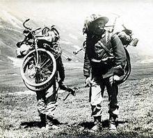 Numerous experiments were carried out in the late 19th century to determine the possible role of bicycles and cycling within military establishments, primarily because they can carry more equipment and travel longer distances than walking soldiers. The development of pneumatic tires coupled with shorter, sturdier frames in the late 19th century led military establishments to investigate their applicability.[1] To some extent, bicyclists took over the functions of dragoons, especially as messengers and scouts, substituting for horses in warfare.[2] Bicycle units or detachments were in existence by the end of the 19th century in most armies. The United Kingdom employed bicycle troops in militia or territorial units, rather than in regular units. Essentially this reflected the popularity of cycling amongst the civilian population and the perceived value of bicycles in providing increased mobility for home defence units.[3]