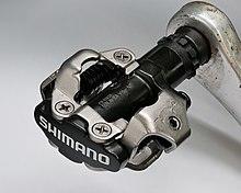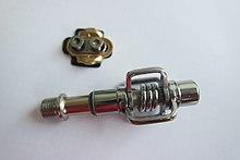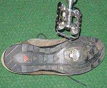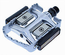 Clipless pedals (also clip-in or step-in) require a special cycling shoe with a cleat fitted to the sole, which locks into a mechanism in the pedal and thus holds the shoe firmly to the pedal. Most clipless pedals lock onto the cleat when stepped on firmly and unlock when the heel is twisted outward, although in some cases the locking mechanism is built into the cleat instead of the pedal. Clipless refers to the toe clip (cage) having been replaced by a locking mechanism and not to platform pedals which would normally not have toe clips. The clipless pedal was invented by Charles Hanson in 1895.[3] It allowed the rider to twist the shoe to lock and unlock and had rotational float (the freedom to rotate the shoe slightly to prevent joint strain).[4] The M71 was a clipless pedal designed by Cino Cinelli and produced by his company in 1971. It used a plastic shoe cleat which slid into grooves in the pedal and locked in place with a small lever located on the back side of the pedal body. To release the shoe a rider had to reach down and operate the lever, similar to the way a racing cyclist had to reach down and loosen the toestrap. The lever was placed on the outside edge of the pedal so that in the event of a fall the lever hitting the ground would release the foot. The pedal was designed for racing, in particular track racing, and because of the need to reach down to them to unclip, they have been referred to as "death cleats".[5] In 1984, the French company Look applied downhill snow skiing binding or cleat technology to pedals, producing the first widely used clipless pedals. Initially used by triathletes in order to facilitate faster "transitions", Bernard Hinault's victory in Tour de France in 1985 then helped secure the acceptance of quick-release clipless pedal systems by cyclists. Those pedals, and compatible models by other manufacturers, remain in widespread use today. The cleat is engaged by simply pushing down and forward on the pedal, or, with some designs, by twisting the cleat in sideways. Then, instead of loosening a toestrap or pulling a lever, the cyclist releases a foot from the pedal by twisting the heel outward.
