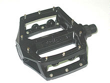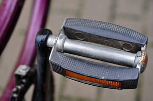 The quill pedal is a common pedal system on bicycles. It consists of a main axle section that is attached to the bicycle crank arm and contains extensions from the axle to which parallel cage plates are attached at the front and rear of the pedal. In order to utilize the quill pedal, the cyclist pushes his foot against the platform formed by the parallel cage plates.[1]