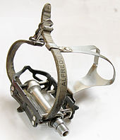 To improve the performance of the quill pedal toe clips were added. The toe clip is a thin metal or plastic attachment to the front cage of the pedal. The toe clip is shaped like the toe of a shoe and its function is to prevent a cyclist's shoe from slipping off the pedal during the forward pedaling motion.[1] A further enhancement of the quill pedal was modifying the toe clip to allow a strap and buckle to go around or through both the pedal and the toe clip to encircle the cyclist's foot on the top of the pedal.[1] This strap is generally made of leather or nylon.