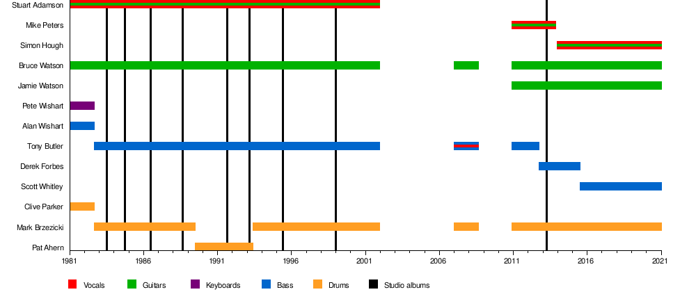 Big Country comprised Stuart Adamson (formerly of Skids, vocals/guitar/keyboards), Bruce Watson (guitar/mandolin/sitar/vocals), Tony Butler (bass guitar/vocals) and Mark Brzezicki (drums/percussion/vocals).[1] Before the recruitment of Butler and Brzezicki an early incarnation of Big Country was a five-piece band, featuring Peter Wishart (later of Runrig and now a Scottish National Party MP) on keyboards, his brother Alan on bass, and Clive Parker, drummer from Spizz Energi/Athletico Spizz '80.[1] Parker had approached Adamson to join his new band after the demise of Skids.