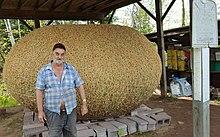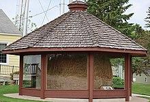 Darwin, Minnesota, is the home of a ball of baler twine rolled by Francis A. Johnson. It is 12 feet (3.7 m) in diameter and weighs 17,400 pounds (7,900 kg; 8.7 short tons). Johnson began rolling the twine in March 1950, and wrapped four hours every day for 29 years. It is currently housed in a makeshift pagoda across from the town park on Main Street at (45°05′47″N 94°24′37″W / 45.096332°N 94.410276°W) to prevent the public from touching it. The town celebrates "Twine Ball Day" on the second Saturday in August every year. An adjacent volunteer-run, free to visit museum and gift shop has information on the history of the ball, as well as selling a variety of souvenirs.[3][6][7][8] It was the long-standing holder of the "biggest ball of twine" title in the Guinness Book of World Records, holding the title from its completion in 1979 until 1994, and was referenced by "Weird Al" Yankovic in his 1989 song "The Biggest Ball of Twine in Minnesota."[5]