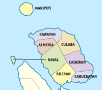 Biliran is subdivided into 8 municipalities, with a total of 132 barangays. All municipalities are located on Biliran Island, with the exception of Maripipi, which is an island municipality located to the northwest. The largest among the towns in terms of land area is the provincial capital Naval, while the smallest is Maripipi.