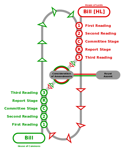In the British/Westminster system, for a new law to be made it starts off as a bill and has to go through the 7 stages of the legislative process. These are: First Reading, Second reading, Committee stage, Report Stage, Third Reading, Opposite House, and then Royal Assent. A bill is introduced usually by a Member of Parliament (MP) in the House of Commons or by a member of the House Of Lords.