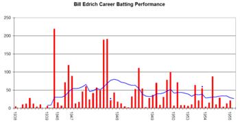 All told, Edrich played in 571 first-class matches between 1934 and 1958, scoring 36,985 runs, with a highest score of 267 not out. His run total puts him 29th on the all-time lists. He scored 2,440 runs for England in his 39 Test matches, with the 219 not out at Durban his best.[1] A professional before the Second World War, he turned amateur afterwards and captained Middlesex jointly with Compton in 1951 and 1952, continuing in sole charge from 1953 to 1957. After retiring from Middlesex, he returned to Norfolk and played Minor County cricket until he was 56, captaining the county until 1971.[1]