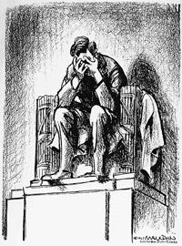 In 1962, Mauldin moved to the Chicago Sun-Times. One of his most famous post-war cartoons was published in 1963, following the assassination of President John F. Kennedy. It depicted the statue of Abraham Lincoln at the Lincoln Memorial, with his head in his hands.[12]