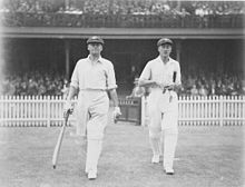 He set the tone with an opening stand of 162 with fellow Victorian Ponsford in the second Test at Lord's. Ponsford was dismissed immediately after the teams had an audience with King George V.[50] Woodfull then made a 231-run stand with Bradman (254) in only two and a half hours and reached 155.[41][50] Australia put themselves in control with 6/729 declared. Woodfull was unbeaten on 26 in the second innings as Australia reached 72 to complete a seven-wicket triumph.[19] Woodfull then won the toss for the first time and contributed 50 to a stand of 192 with Bradman in the third Test at Headingley (the match in which Bradman scored 309 in a day).[30][41] Australia reached 566 but rain helped England to a draw after being forced to follow on.[29][41] Woodfull scored 54 as the fourth Test was rained out before the second innings.[29][51] With the series tied at 1–1 the fifth Test at The Oval was a timeless match. Woodfull won the toss and after England made 405, he scored 54 as Australia amassed 695 to win by an innings and regain the Ashes 2–1.[19][29][30] During the Tests, Woodfull had contributed 345 runs at 57.50, second only to Bradman.[41] In all first-class matches, he compiled 1,435 runs at 57.36 including six centuries. Woodfull and his fellow Victorian Ponsford played a significant part by making three century opening stands—162 at Lord's, 159 at The Oval and 106 at Old Trafford to help Australia take the initiative in three Tests.[2][28] The Times commented that "No praise is too high for Woodfull" and commended the Australian captain's encouragement of his young team.[52]