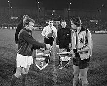 Manager Don Revie took the England management job in July 1974. Bremner applied for the vacant Leeds job after Johnny Giles had been named by Revie as his successor, but instead the board surprised everyone by appointing Brian Clough, who went on to a disastrous 44-day spell in charge of Leeds at the start of the 1974–75 season.[55] Revie's departure was tough for Bremner, who had a strong bond with his manager.[55] Leeds lost the 1974 FA Charity Shield in a penalty shoot-out to Liverpool, but more significantly Bremner and Kevin Keegan were sent off for fighting and received eleven game suspensions.[56] By the time Bremner was allowed to play again Jimmy Armfield was the manager, though he refuted the accusation that he had attempted to undermine Clough as "ridiculous".[57] Teammate Peter Lorimer insisted that the only criticism he had of Bremner was in applying for the management job against Giles, which had caused to board to look elsewhere for fear of dividing the dressing room by choosing between Bremner and Giles.[58] Results improved with Bremner back in the side, and though they ended the season in ninth place, they were only eight points behind champions Derby. The club's biggest aim would be success in the European Cup, and they made it to the final after knocking out FC Zürich (Switzerland), Újpest FC (Hungary), Anderlecht (Belgium), and Barcelona (Spain). Their final opponents at Parc des Princes were defending champions Bayern Munich (Germany), who beat Leeds 2–0; United had a goal controversially ruled out for offside and the tie ended in rioting by United fans.[59]
