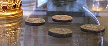 The four coins in the Bimaran casket are of the same type: tetradrachms of debased silver in the name of Azes, in near-new condition.[8] On the obverse they show a king on a horse to the right with right hand extended, with a three-pellet dynastic mark and a circular legend in Greek.[8] The legend reads in corrupted Greek WEIΛON WEOΛΛWN IOCAAC (that is, ΒΑΣΙΛΕΩΣ ΒΑΣΙΛΕΩΝ ΑΖΟΥ) "King of Kings Azes". On the reverse appears a figure of Tyche standing and holding a cornucopia, with a Kharoshthi legend.[8] The legend reads 'Maharajasa mahatasa Dhramakisa Rajatirajasa Ayasa "The Great king followower of the Dharma, King of Kings Azes".
