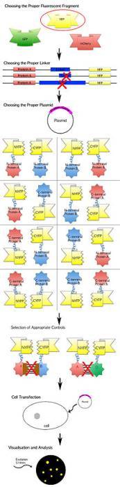 Once the fusion proteins and controls have been designed and generated in their appropriate expression system, the plasmids must be transfected into the cells to be studied. After transfection, one must wait, typically about eight hours, to allow time for the fusion proteins to interact and their linked fluorescent reporter protein fragments to associate and fluoresce.[8]