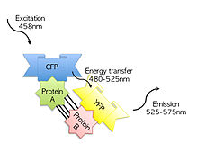 Fluorescence resonance energy transfer (FRET), also known as förster resonance energy transfer, resonance energy transfer (RET) or electronic energy transfer (EET), is based on the transfer of energy from an excited (donor) chromophore or fluorophore (if the chromophores are fluorescent) to a nearby acceptor. In this method, fluorophores are chemically linked or genetically fused to two proteins hypothesised to interact. If the proteins interact, this will bring the fluorophores into close spatial proximity. If the fluorophores are oriented in a manner that exposes the fluorophores to one another, usually ensured when designing and constructing the fluorophore-protein linkage/fusion, then the energy transfer from the excited donor fluorophore will result in a change in the fluorescent intensities or lifetimes of the fluorophores.[1][13]