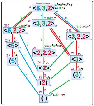 In mathematics, the binary icosahedral group 2I or ⟨2,3,5⟩ is a certain nonabelian group of order 120. It is an extension of the icosahedral group I or (2,3,5) of order 60 by the cyclic group of order 2, and is the preimage of the icosahedral group under the 2:1 covering homomorphism