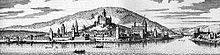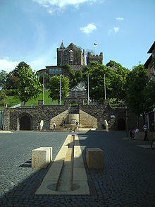 The presbyter Aetherius of Bingen founded sometime between 335 and 360 a firmly Christian community. Bearing witness to this time is Aetherius's gravestone, which can still be seen in Saint Martin's Basilica.[4][5] After the fall of the Limes, the town became a Frankish royal estate and passed in 983 by the Donation of Verona from Otto II to Archbishop Willigis of Mainz.[6] Under Otto III the Binger Kammerforst (forest) came into being. Under Willigis, some way up the river Nahe, the stone Drususbrücke (bridge) was built.[7]