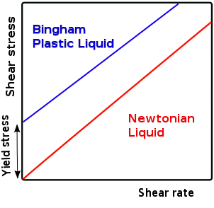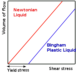 Figure 1 shows a graph of the behaviour of an ordinary viscous (or Newtonian) fluid in red, for example in a pipe. If the pressure at one end of a pipe is increased this produces a stress on the fluid tending to make it move (called the shear stress) and the volumetric flow rate increases proportionally. However, for a Bingham Plastic fluid (in blue), stress can be applied but it will not flow until a certain value, the yield stress, is reached. Beyond this point the flow rate increases steadily with increasing shear stress. This is roughly the way in which Bingham presented his observation, in an experimental study of paints.[3] These properties allow a Bingham plastic to have a textured surface with peaks and ridges instead of a featureless surface like a Newtonian fluid.