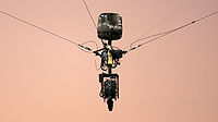 The film was the first to be partially shot with the Skycam, a computer-controlled, cable-suspended camera system created by Garrett Brown, inventor of the Steadicam. The Skycam had 100-foot high posts with four hanging wires controlled by a computer, and a lightweight Panavision camera with 200 feet of film hung at the center of the wires.[6][8] The filmmakers intended to use the Skycam to fully depict Birdy's point of view during a fantasy sequence in which he imagines himself as a bird flying,[6] but they encountered difficulties, as the camera would often malfunction. Although the Skycam proved successful on its first take, Parker insisted that the filmed footage be shot more rapidly, but the camera system malfunctioned during its second take, after capturing 40 seconds of footage. This resulted in the camera operators shooting the remainder of the sequence with a Steadicam mounted on top of an improvised camera dolly.[6]