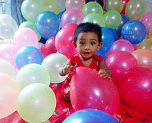 A one-year-old girl playing with her birthday balloons in Bangladesh