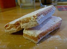 The Old French word bescuit is derived from the Latin words bis (twice) and coquere, coctus (to cook, cooked), and, hence, means "twice-cooked".[5][n 1] This is because biscuits were originally cooked in a twofold process: first baked, and then dried out in a slow oven.[6] This term was then adapted into English in the 14th century during the Middle Ages, in the Middle English word bisquite, to represent a hard, twice-baked product[7] (see the German Zwieback). The Dutch language from around 1703 had adopted the word koekje ("little cake") to have a similar meaning for a similar hard, baked product.[8] The difference between the secondary Dutch word and that of Latin origin is that, whereas the koekje is a cake that rises during baking, the biscuit, which has no raising agent, in general does not (see gingerbread/ginger biscuit), except for the expansion of heated air during baking. Another cognate Dutch form is beschuit, which is a circular and brittle grain product usually covered by savoury or sweet toppings and eaten at breakfast.