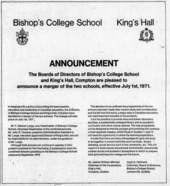 In 1972, its sister school King's Hall, Compton was amalgamated with BCS under the direction of both school's boards as well as the Québec government under the Company Acts of Québec. Consequently, BCS became one of the first co-ed boarding schools in Canada.