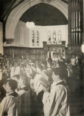 In 1941, The headmaster the Rt. Rev. Edward Bidwell left to become the Assistant Bishop of Canterbury and the Bishop of Ontario. In 1955, the 18th Governor General of Canada the Rt. Hon. Vincent Massey inspected the BCS cadet corps. In 1958 the school gym/ballroom was consecrated as St.Martin's Chapel by order of the Lord Bishop of Québec, The Rt. Reverend Philip Carrington and BCS students no longer used the chapel at Bishop's University.[4] An organ was installed behind the Cross in 1958. A stained glass window was given to BCS during the closing ceremony of St. Helen's School, Dunham, Québec. It is now installed at the top of the staircase to the chapel. BCS has grown more secular entering into the 21st century.