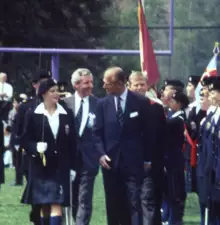 In 1901, the cadet corps took part in the Guard of Honour during the visit of Duke (later King George V) and Duchess of York to Sherbrooke. The Cader Corps was also inspected by the Duke of Devonshire, King Edward VIII in 1919, King George VI in 1939 and Queen Elizabeth The Queen Mother in 1962.[15] In May 1989, the school's annual cadet inspection was inspected by The Duke of Edinburgh with a crowd of two thousand people.[16] The Duke also granted the school's new coats of arms registered under the Royal Heraldry Society of Canada.[17]