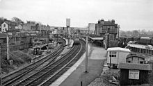 For most of the station's life, four lines passed through it (as opposed to the current three lines); up and down main lines to the west of the now much extended island platform, and a branch line and passing loop (with access to turntable) to the east of the island platform, the northern end of which was located where the footbridge is today.