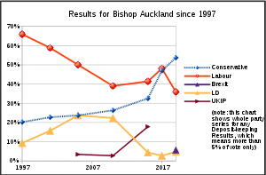From 1935 to 2017 inclusive, the seat's voters returned MPs from the Labour Party; the former Labour Chancellor of the Exchequer Hugh Dalton, was the MP for Bishop Auckland from 1929–1931, and after regaining the seat in 1935, remained MP until 1959. The 2019 result returned a Conservative, whose results had shown an increase from election to election, from 1997.