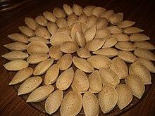 Almonds were one of the earliest domesticated fruit trees, due to "the ability of the grower to raise attractive almonds from seed. Thus, in spite of the fact that this plant does not lend itself to propagation from suckers or from cuttings, it could have been domesticated even before the introduction of grafting".[12] Domesticated almonds appear in the Early Bronze Age (3000–2000 BC), such as the archaeological sites of Numeira (Jordan),[13] or possibly earlier. Another well-known archaeological example of the almond is the fruit found in Tutankhamun's tomb in Egypt (c. 1325 BC), probably imported from the Levant.[12] An article on Almond tree cultivation in Spain is brought down in Ibn al-'Awwam's 12th-century agricultural work, Book on Agriculture.[15]