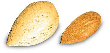 The fruit of the almond is a drupe, consisting of an outer hull and a hard shell with the seed, which is not a true nut, inside. Shelling almonds refers to removing the shell to reveal the seed. Almonds are sold shelled or unshelled. Blanched almonds are shelled almonds that have been treated with hot water to soften the seedcoat, which is then removed to reveal the white embryo.