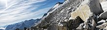 A bivouac shelter is any of a variety of improvised camp site, or shelter that is usually of a temporary nature, used especially by soldiers, or persons engaged in backpacking, bikepacking, scouting, or mountain climbing.[1] It may often refer to sleeping in the open with a bivouac sack, but it may also refer to a shelter constructed of natural materials like a structure of branches to form a frame, which is then covered with leaves, ferns, and similar material for waterproofing and duff (leaf litter) for insulation. Modern bivouacs often involve the use of one or two man tents but may also be without tents or full cover.[2] In modern mountaineering the nature of the bivouac shelter will depend on the level of preparedness; in particular whether existing camping and outdoor gear may be incorporated into the shelter.[3] A bivouac shelter is colloquially known as a bivvy (also spelled bivy or bivvi or bivi).
